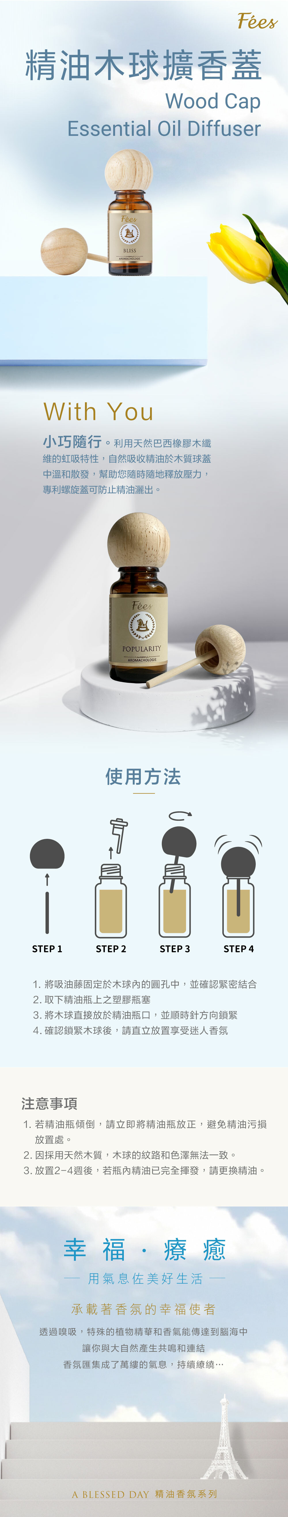 利用天然木材纖維的虹吸特性,自然吸收精油於木質球蓋中溫和散發,專利螺旋蓋可防止精油意外濺灑。