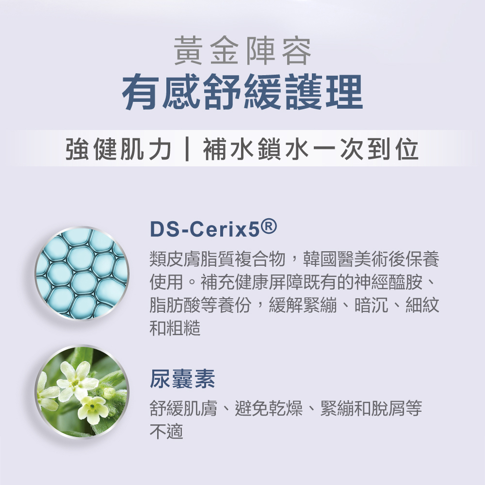 深層潤澤與修護功能,有鎮靜舒緩效果,舒緩乾燥導致的不適與脫屑現象,質地柔滑延展佳,可全面用於臉、手、腳跟、膝蓋等多部位。