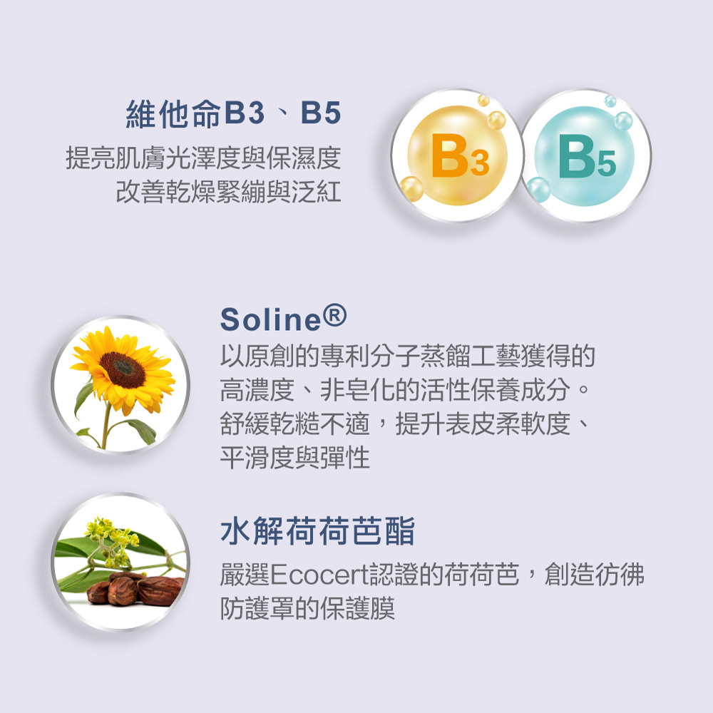 結合多重修護與保濕成分,深層補水同時強化肌膚屏障,提升鎖水力,舒緩乾燥不適。DS-Cerix® 5與Soline®協同修護粗糙與彈性,水解荷荷芭酯形成透氣保護膜,維他命活性成分提亮膚色,質地輕盈不黏膩,溫和守護嬌嫩膚質,全年適用。