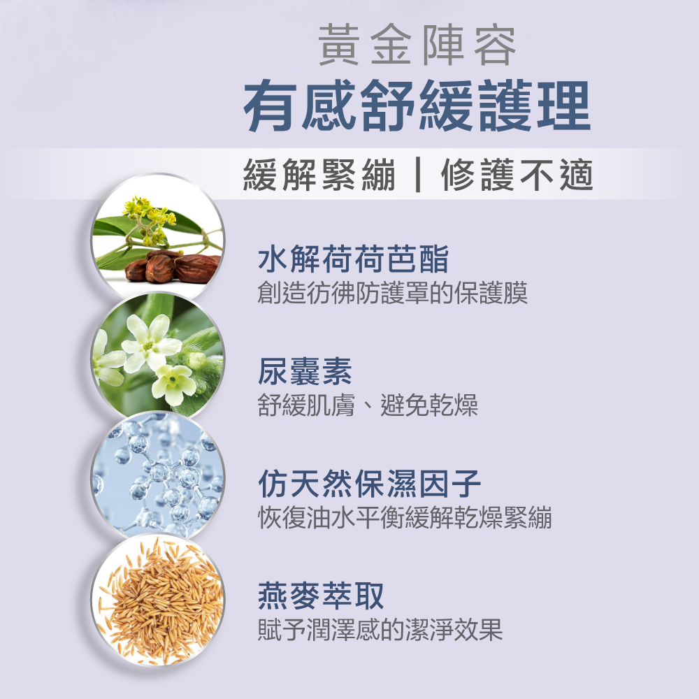 採用胺基酸界面活性劑,溫和潔淨不刺激,弱酸性pH值親膚不破壞屏障。結合水解荷荷芭酯、尿囊素、仿天然保濕因子與燕麥萃取,洗後潤澤不緊繃,舒緩乾燥脫屑,從新生兒到成人都適用