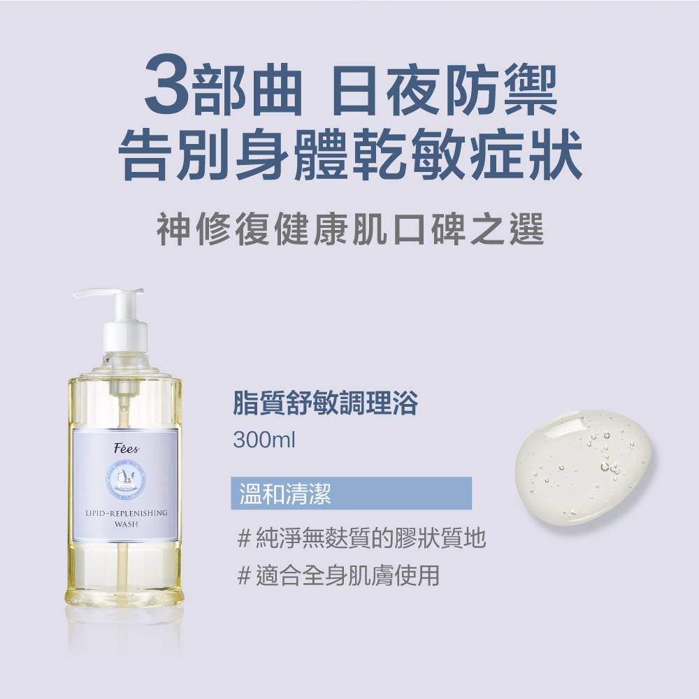 專為乾燥、易泛紅、粗糙、脫屑肌膚打造,調理並修護肌膚屏障,使用弱酸性、溫和清潔的調理浴液,幫助建立健康膚況