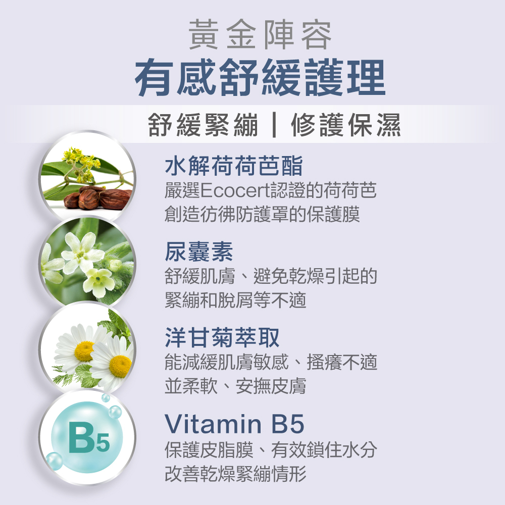 胺基酸系潔淨成分,溫和不刺激,細緻泡沫輕柔洗淨,維持肌膚屏障完整。富含水解荷荷芭酯、洋甘菊、尿囊素與維他命B5,深層保濕修護
