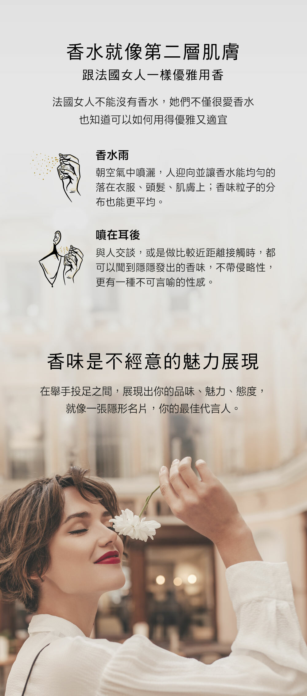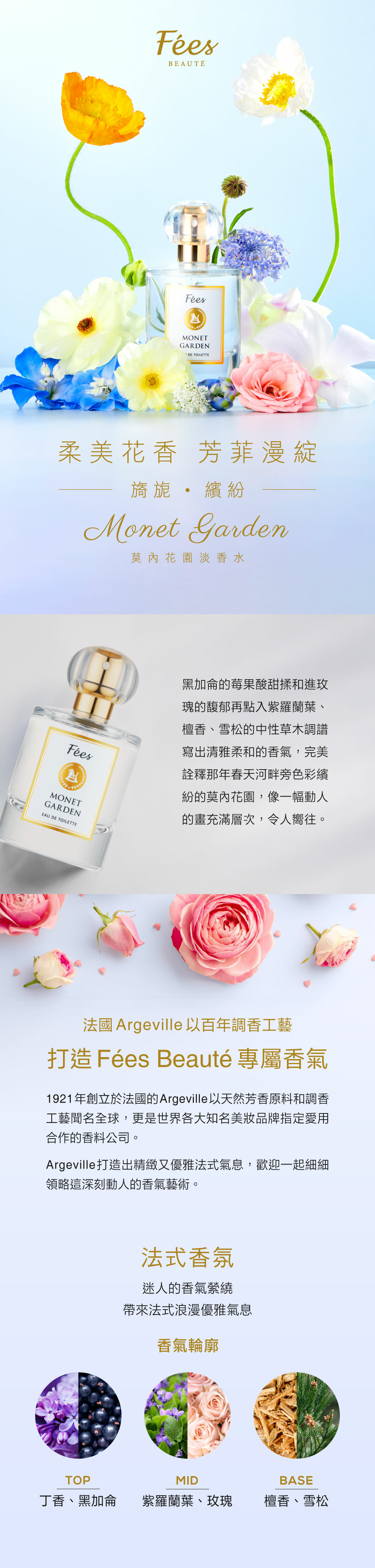 清雅柔和的香氣,完美詮釋那年春天河畔旁色彩繽紛的莫內花園,就像一幅動人的畫充滿層次,令人嚮往。