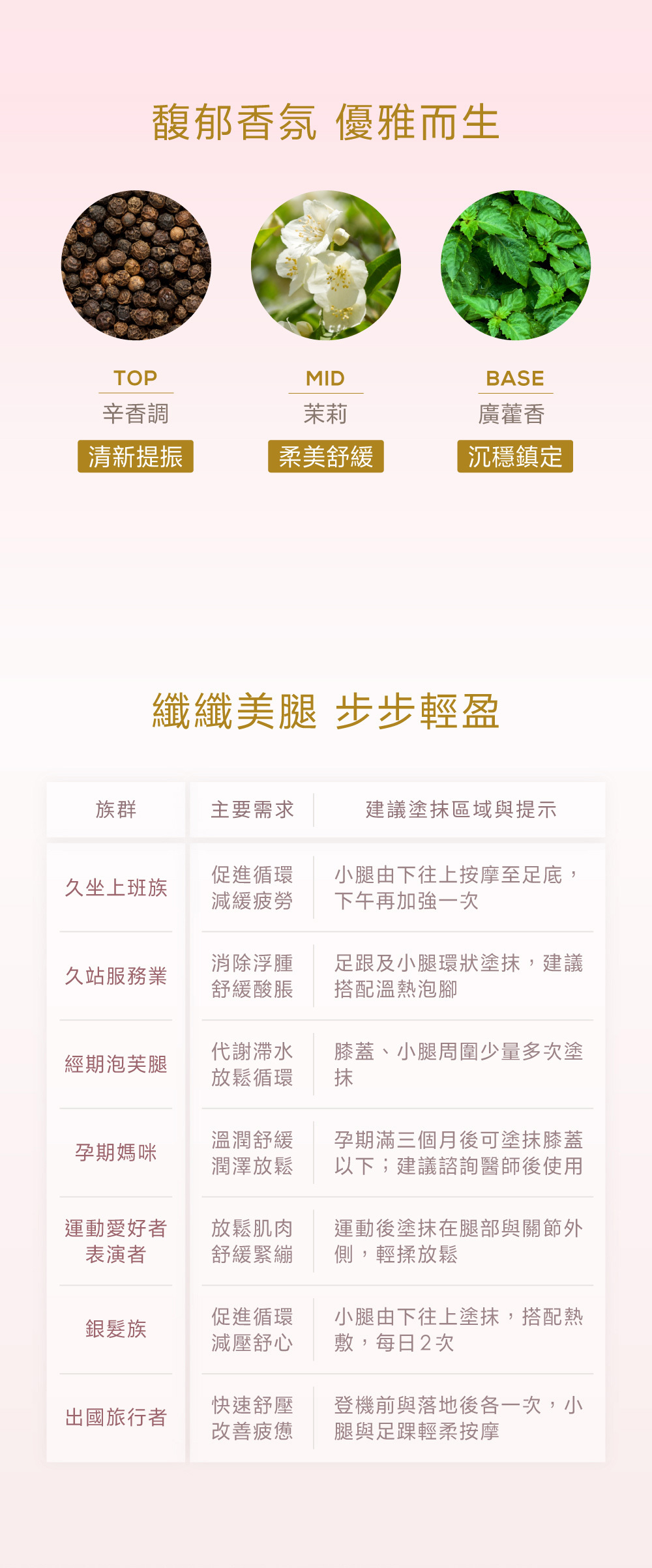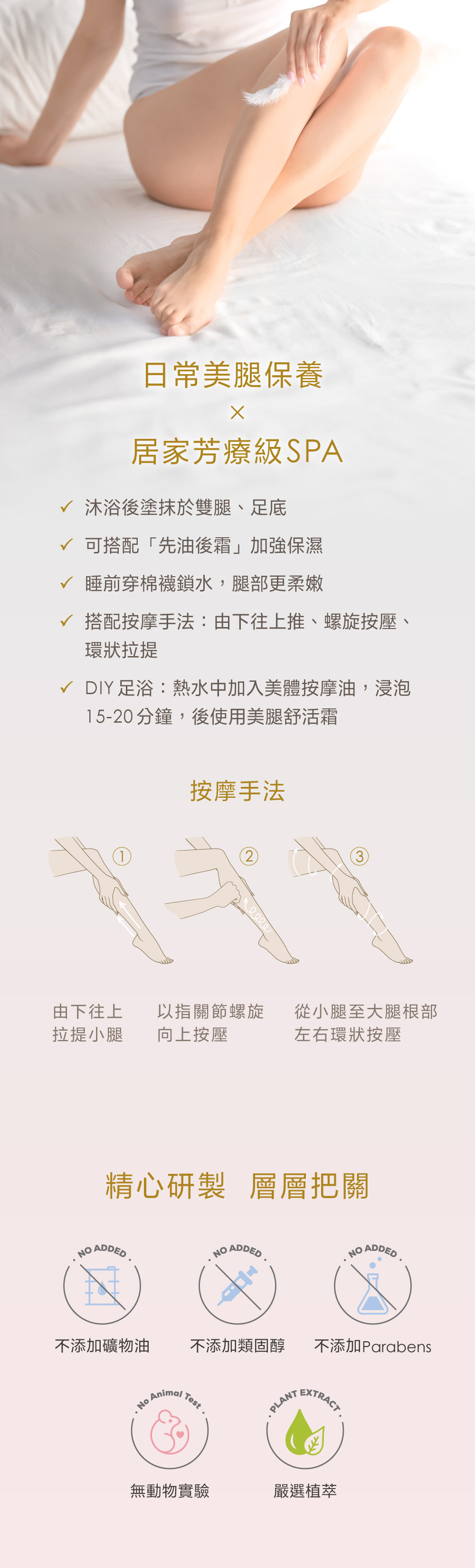 融合法國植物精華與芳療香氣,從肌膚到嗅覺全面舒緩疲勞,讓雙腿回歸輕盈柔嫩的狀態,勻亮膚觸,重現美腿線條。