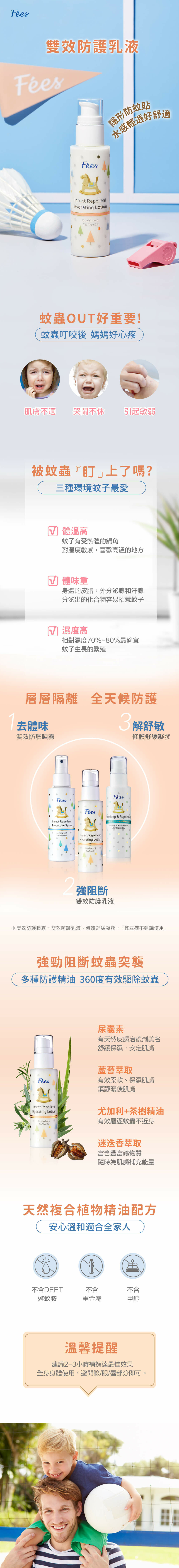 適合經常接觸戶外、散步、露營、玩耍或運動時易受蚊蟲叮咬的嬰幼兒與兒童使用