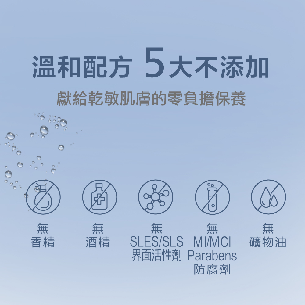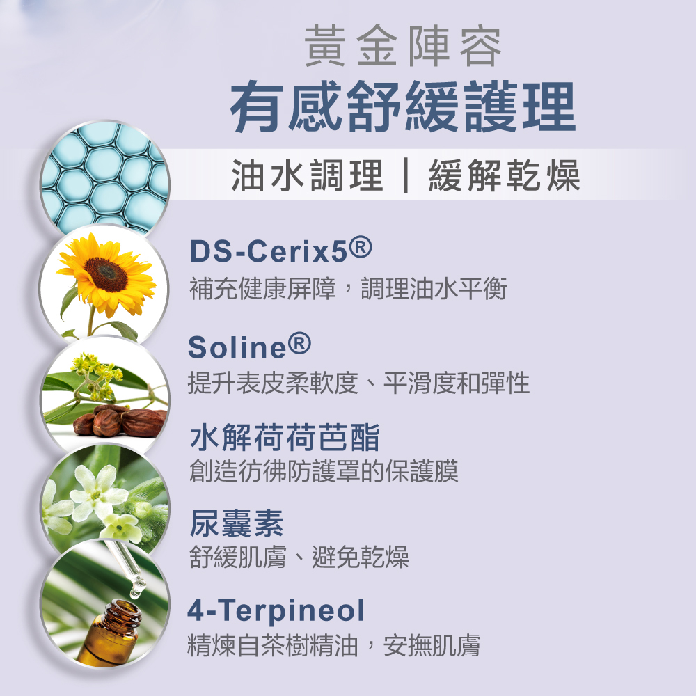 DS-Cerix® 5強化屏障、調理水油,Soline®提升柔軟彈性,水解荷荷芭酯鎖水防護。尿囊素舒緩乾燥,4-Terpineol溫和調理,肌膚持久柔嫩穩定